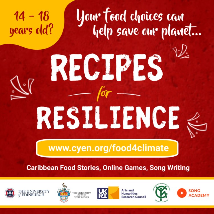 Funded by the UKRI-AHRC, Recipes for Resilience is an interdisciplinary project with scholars and collaborators from the University of Edinburgh, the University of West Indies, SOAS University of London, Black Open University, the Caribbean Youth Environment Network (CYEN), and Song Academy that aims to re-connect Caribbean youth and their elders through activities that encourage reflection on food heritage, production, and consumption in the context of climate change resilience and action.